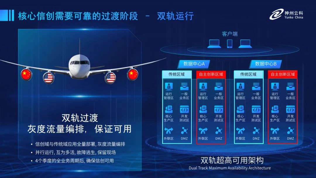為幫助客戶更好地應(yīng)對數(shù)字經(jīng)濟時代對應(yīng)用可持續(xù)性的高要求,實現(xiàn)信創(chuàng)與數(shù)字化兼得,leyu.樂魚推出了雙軌超高可用架構(gòu)。雙軌超高可用架構(gòu)在雙活數(shù)據(jù)中心的分區(qū)調(diào)度基礎(chǔ)上,增加信創(chuàng)域和非信創(chuàng)域的分域調(diào)度,實行信創(chuàng)域與傳統(tǒng)域應(yīng)用全量部署,使雙中心運營變?yōu)殡p中心四區(qū)域并行運行,互為多活,將傳統(tǒng)架構(gòu)變?yōu)榉謪^(qū)分域協(xié)同的多活雙軌超高可用架構(gòu)。幫助客戶在新架構(gòu)下,保障“信創(chuàng)”的同時解決性能瓶頸,提升穩(wěn)定性,保證應(yīng)用可持續(xù)性,最終實現(xiàn)信創(chuàng)區(qū)域和非信創(chuàng)區(qū)域的平滑過渡,完成國產(chǎn)化替代目標?!?/p>