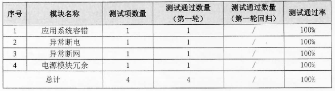 可靠性方面:測試范圍包括應(yīng)用系統(tǒng)容錯(cuò)、異常斷電、異常斷網(wǎng)、電源模塊冗余共4個(gè)模塊,執(zhí)行四條用例,全部通過。