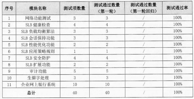 功能性方面:測試范圍包括網(wǎng)絡(luò)功能測試、SLB健康檢查、SLB負(fù)載均衡算法、SLB會話保持功能、SLB安全防護(hù)、SLB擴(kuò)展測試等11個(gè)模塊,共計(jì)執(zhí)行40條用例,均通過測試。